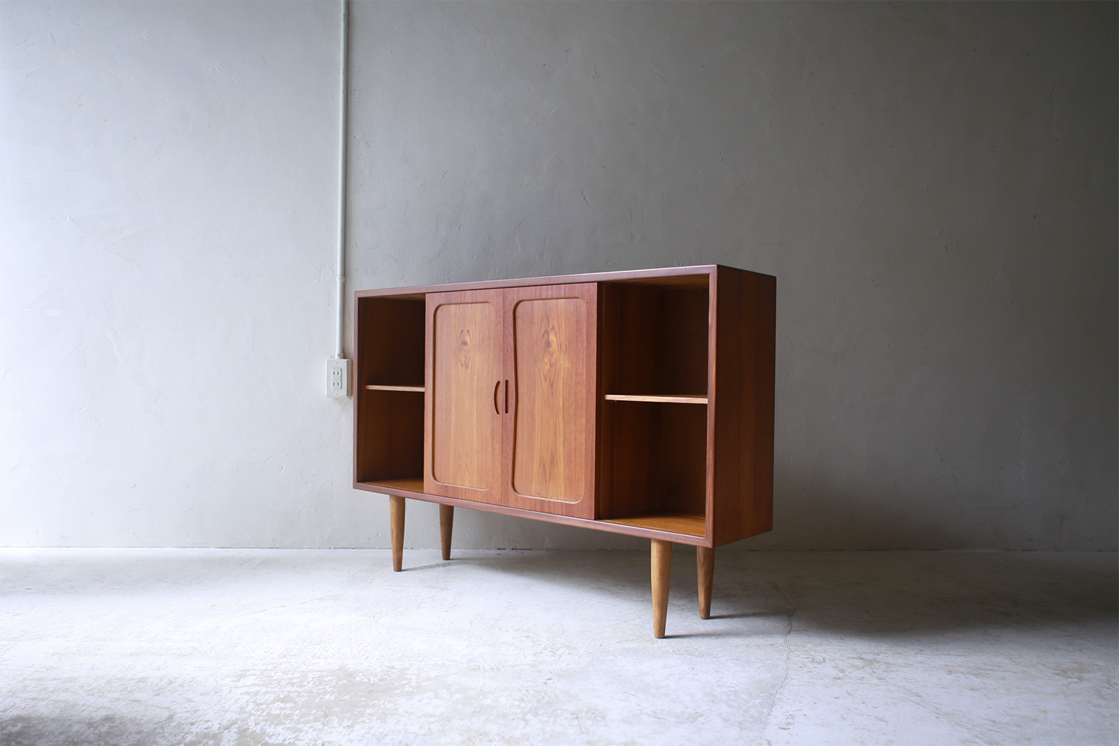 デンマーク製、ヴィンテージキャビネットの入荷です。使い勝手の良いW1240mmと奥行き240mmの薄型サイズは空間を邪魔せずリビングや寝室などの細々したものをきれいに片付けてくれます。飾り棚として見せるものと隠すもの、また鏡や絵画と組み合わせても◎ 深みのあるチーク材にオーク材の脚、とてもバランスのとれたキャビネットです。